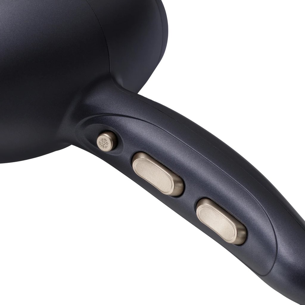 Fén profesionální kvality Bio Ionic GoldPro™ Collection. Výkonný motor s výkonem 2000 W je energeticky úspornější a má delší životnost než standardní motory, což umožňuje rychle vysušit všechny typy vlasů a poskytuje vynikající ochranu proti krepatění.